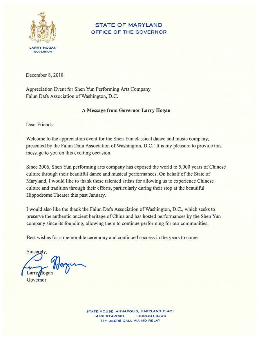 馬里蘭州巴爾的摩演出前夕,馬里蘭州州長Larry Hogan向神韻藝術團發來賀信。(大紀元圖片)