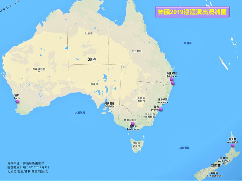 2019年2月8日開始,神韻藝術團將在大洋洲展開巡演之旅,其中包括悉尼、黃金海岸、墨爾本、布里斯本、珀斯和新西蘭的奧克蘭。(大紀元製圖)