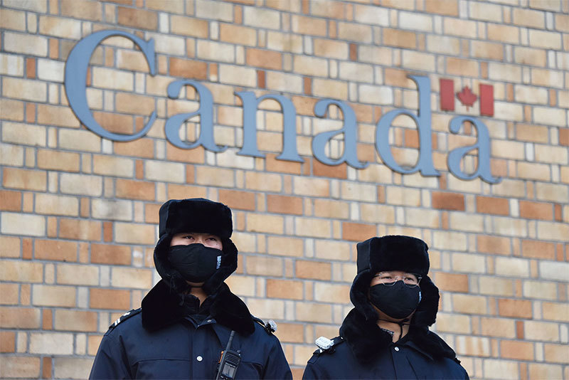 中共外交部在孟晚舟被捕一案上措辭極端,透射出中共「霸道外交」的黑幫心態。圖為2018年12月10日加拿大駐北京大使館外守衛。(AFP)