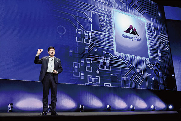 雖然華為能製造小型芯片組,但並不占據這一市場的主要地位。圖為華為消費者業務CEO余承東2018年2月25日在巴塞隆納世界行動通訊大會展示首款5G商用晶片。(AFP)