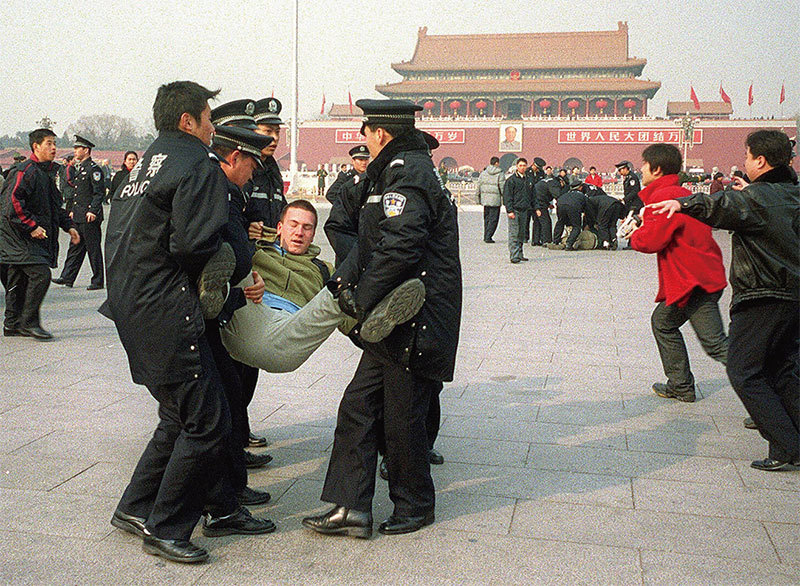 江澤民1999年7月20日開始鎮壓法輪功,其子江綿恆不斷加大力度封鎖互聯網掩蓋真相。圖為法輪功學員在北京天安門廣場被非法抓捕。(AFP)