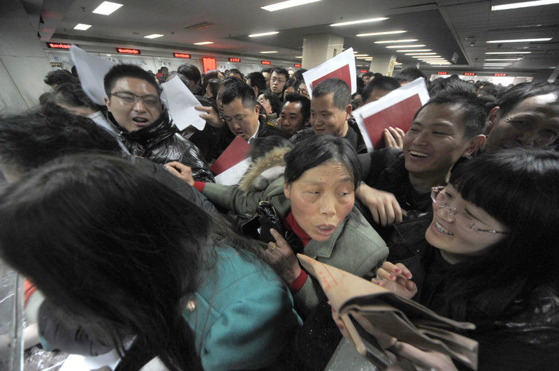中國房市泡沫誘使企業和民眾債務槓桿加到瀕臨斷裂的邊緣。圖為2013年3月,中國百姓搶在政府提高房屋銷售的資本利得稅前擠進南京市房地產交易中心出售二手房。(AFP)