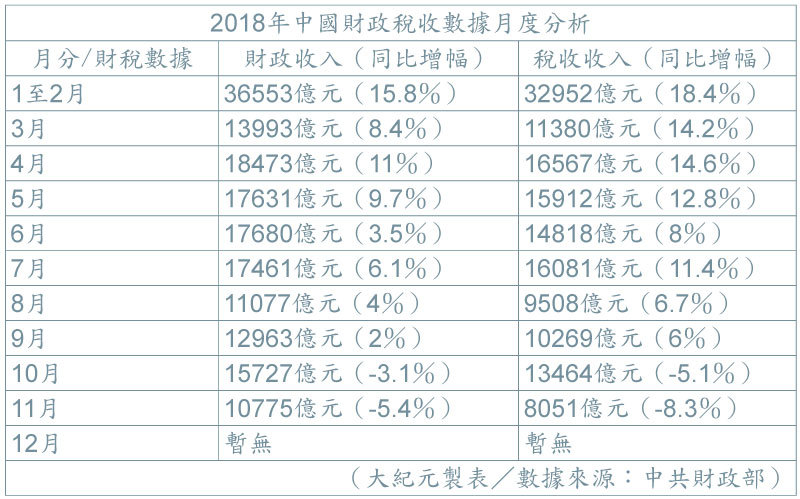 10月起中共財稅收入「急轉折」,從持續增長突變為連續縮減。12月13日,中共財政部公布11月財政收支數據,11月財政收入與4月峰值相比,近乎腰斬。同比下降5.4%,其中稅收收入同比下降8.3%。財稅收入不但連續兩個月同比減少,且降幅創近年最大。