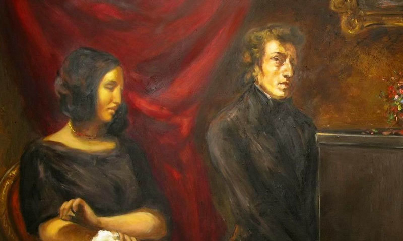 後來在李斯特組織的一次聚會中,蕭邦巧遇喬治桑(Georges Sand)。她是法國當代最活躍的女作家、女權運動者,特異獨行,喜歡打扮成男人。可能兩人迥異的特質使他們互相吸引。很快地,他們便形影不離地出現在巴黎文藝社交圈。