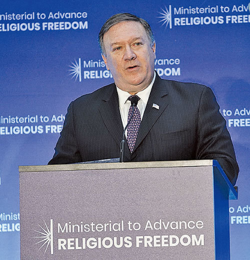 美國國務卿蓬佩奧2018年7月26日在華盛頓特區美國國務院舉行的首屆促進宗教自由部長級會議上致詞。(Getty Images)