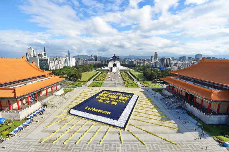來自臺灣及世界各地部分法輪功學員約5400名,2018年11月24日齊聚在臺北自由廣場排出英譯本《轉法輪》。(明慧網圖片)