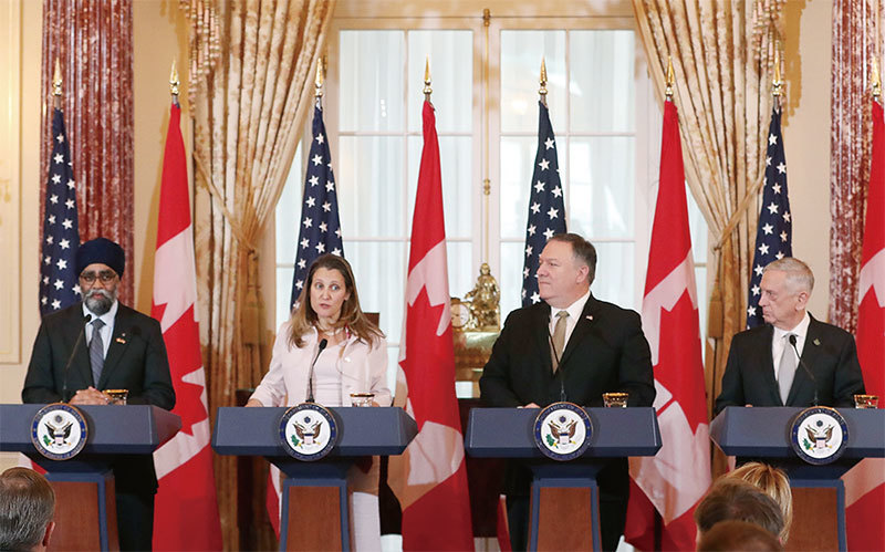 美國國務卿蓬佩奧(右二)、時任國防部長馬蒂斯(右一)與加拿大外交部長方慧蘭(左二)、國防部長石俊(左一)去年12月14日在華府召開新聞會,回應中共拘捕加拿大公民康明凱和斯帕沃爾事件。(Getty Images)