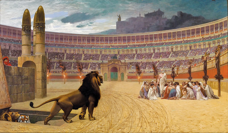 羅馬帝國因迫害基督徒致發生四次大瘟疫而覆滅,圖為〈基督殉道者最後的祈禱〉,中間是一群基督徒在被猛獸撕碎前祈禱。(美國巴爾的摩市沃爾特斯美術館藏)