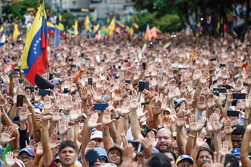 2019年1月23日,百萬委內瑞拉人走上街頭舉起右手,抗議總統馬杜羅(Nicolás Maduro Moros)把國家搞的一團糟,腐敗橫行,民不聊生,要求他下臺,擁護反對黨領袖、國家人民代表大會議長瓜伊多(Juan Guaido)取而代之。瓜伊多在群眾大會上宣誓就任臨時總統,呼籲支持馬杜羅的軍人倒戈,並保證不會清算他們。此景迅速傳遍全球,也震驚了世界上尚存的幾個獨裁體制。