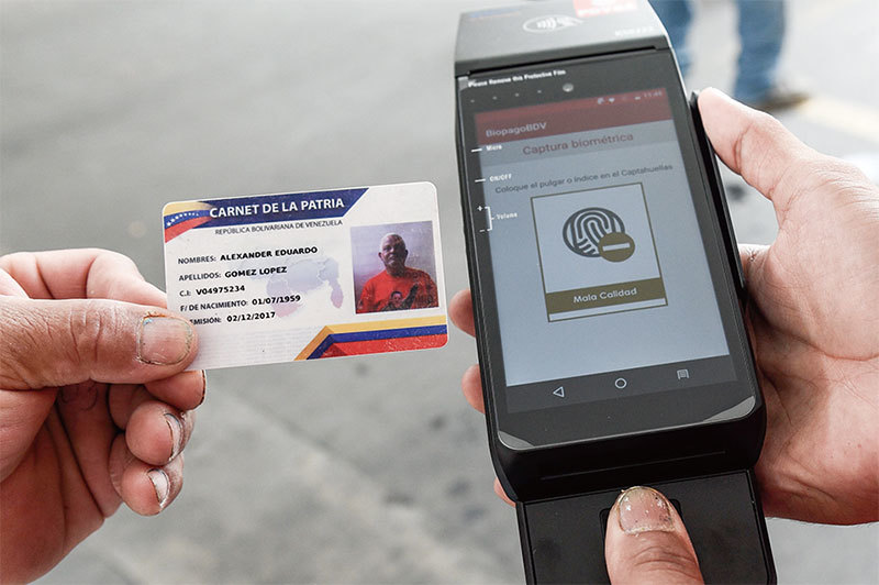 製造「祖國卡」身分證的馬杜羅被稱為現代「謊言之父」,而中共通訊巨頭中興公司則為其極權統治提供技術支持。圖為委內瑞拉民眾用「祖國卡」支付加油費用。(AFP)