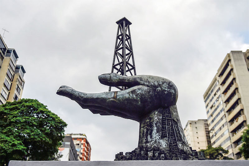 委國政府把石油公司歸為國有,國企的低效率導致石油生產大幅減少。加上2014年至今油價已減半,委內瑞拉經濟受嚴重衝擊。圖為委內瑞拉國有石油公司總部前紀念碑。(AFP)