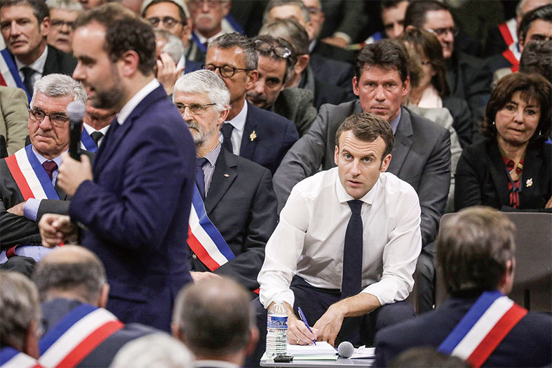 馬克龍前往諾曼底省的一個小鎮,面對612位市長、鎮長、鄉長,他謙卑地做筆記,然後逐一回答問題。辯論會歷時七個小時。(Getty Images)