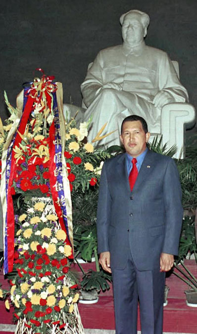 造成委內瑞拉一切苦難的查韋斯,最崇拜毛澤東,毛主席語錄常不離口。圖為查韋斯1999年10月12日赴北京向毛澤東塑像獻花。(AFP)