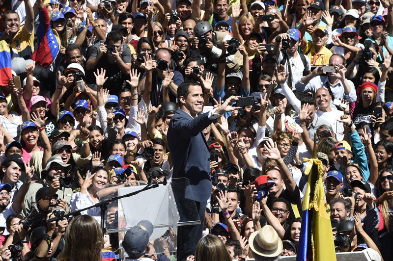 2月12日委內瑞拉臨時總統瓜伊多在加拉加斯集會現場向支持者致意。此前一天,瓜伊多表示,第一個人道援助貨櫃已運抵境內。(AFP)