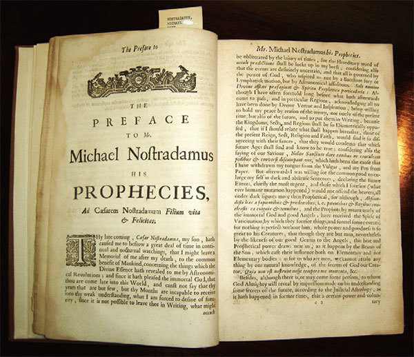 諾查丹瑪斯所著《諸世紀》1672年英譯本,收藏於美國德克薩斯大學安東尼奧健康科學中心的P.I.Nixon醫學歷史圖書館。(Zereshk/Wikimedia Commons)