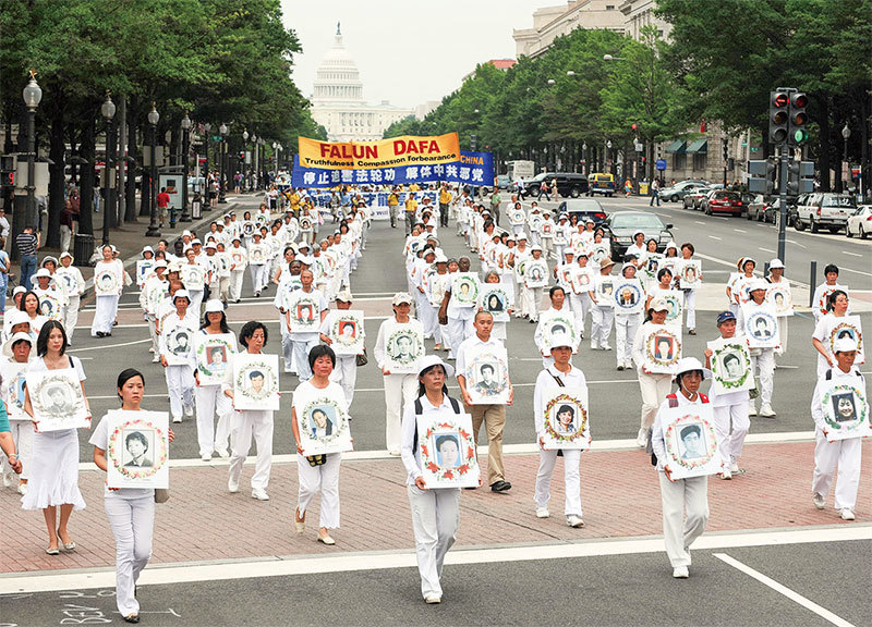 中共於1999年7月20日悍然發動殘酷鎮壓,企圖消滅法輪功。圖為在華府舉行的法輪功反迫害大遊行中,悼念被迫害致死法輪功學員的方陣。(AFP)