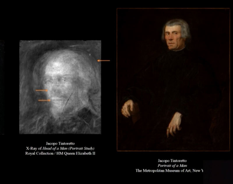 在人才輩出的威尼斯,丁托列多沒有背景,沒有師承。大都會展出的人像,策展人拜爾推測有些畫中人物可能是丁托列多邀約到他的工作室免費為他們畫的,作為社交公關。有些將畫像送給被畫者,有些則留在他工作室。他們從這次展出的畫像用X 射線照出底層,發現這些畫像應該是畫中人物坐在工作室,畫家現場即席而作。這與提香總是有人出高價請他畫像,有著很不同的境遇。