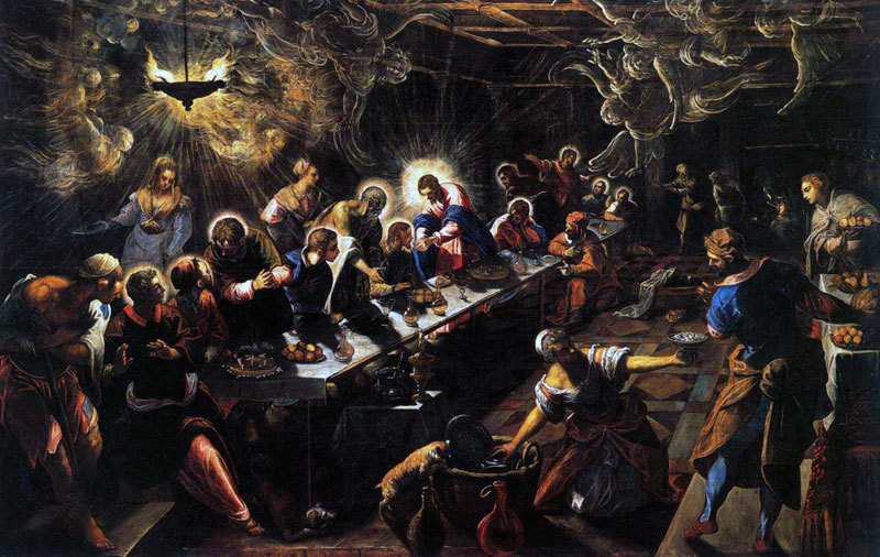 〈最後的晚餐〉(The Last Supper),1592至1594年,油彩.畫布,365×568 公分,聖喬治教堂,威尼斯(S. Giorgio Maggiore, Venice)。(公有領域)