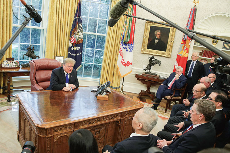 習近平2月22日緊急開政治局會議後,北美時間周五(22日),美中高層貿易談判第二天下午,美國總統特朗普在白宮接見中共貿易代表團。(Getty Images)