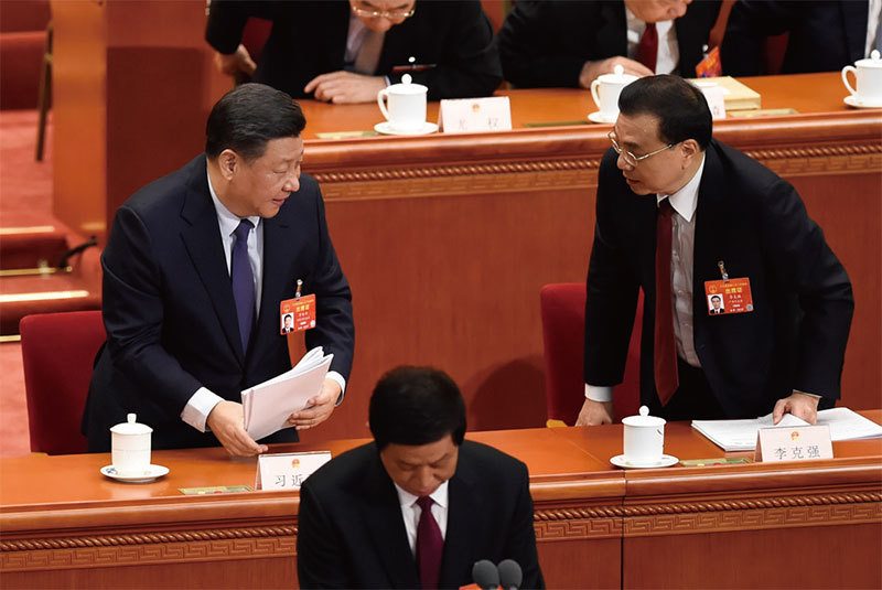《紐時》文章援引所謂「國家領導人的親屬」消息,將批評的矛頭指向習近平,並隱藏離間習近平與李克強等高層的禍心。圖為3月5日習李兩會上的互動。(AFP)