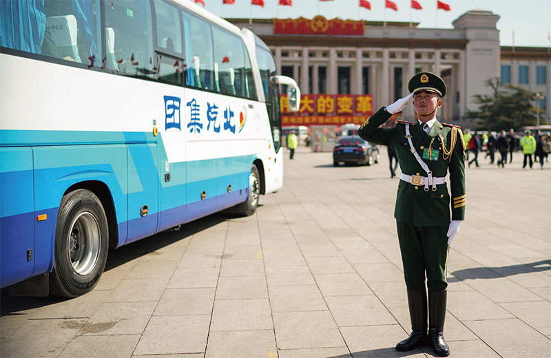 中共兩會前夕,中共高層博弈態勢詭異升級,北京採取一連串動作震懾官場,強調要維護中央權威和習核心地位。圖為3月5日兩會現場。(AFP)
