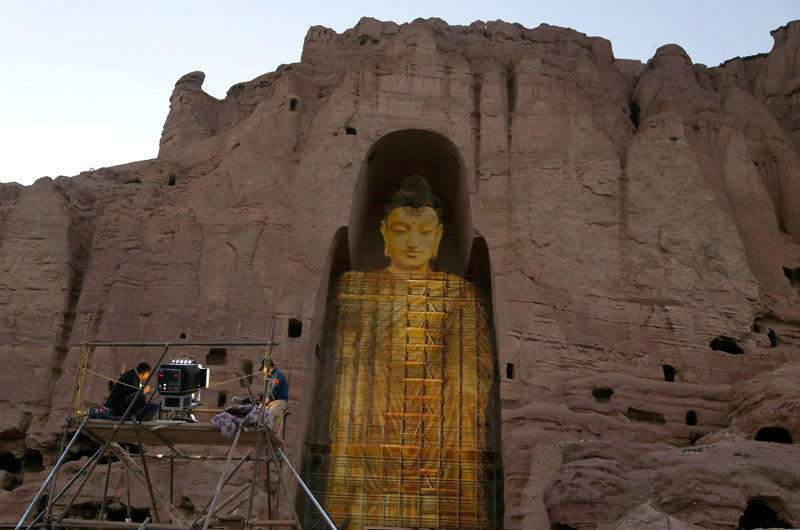 中共毀佛的行徑與恐怖組織塔利班如出一轍。圖為2015年6月7日藝術工作者經由投影圖像,試圖還原2001年被塔利班摧毀的巴米揚大佛。(AFP)