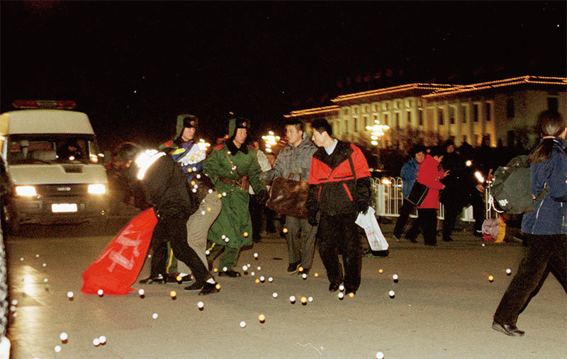 中國素有逢九必亂之說。中共一系列具高度政治敏感性的紀念日全湊在2019年,其中包含迫害法輪功20周年。圖為2000年中國警察在天安門廣場非法抓捕法輪功學員。(Getty Images)