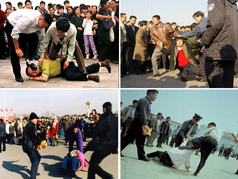 2001年我隨公司去北京出差,大家分頭去買東西,並約好中午12點在天安門廣場的旗桿處集合。到時間後我來到旗旗桿處等待,看到好多老年的青年的男男女女,一人舉個橫幅站在廣場上,突然警車聲大作,好多穿便衣和穿制服的人從廣場四周和警車上衝過來,將舉橫幅的群眾踩倒在地,抓住他們的頭髮用腳狠狠地踢踹,我看到後氣憤極了,覺得這些警察太不講理,心裡想:那些舉橫幅的男青年身體壯,他們上去動手也就算了,可是那些小姑娘和老太太能有多大力氣呢,只是舉個橫幅,為什麼要這樣暴力的對待她們!