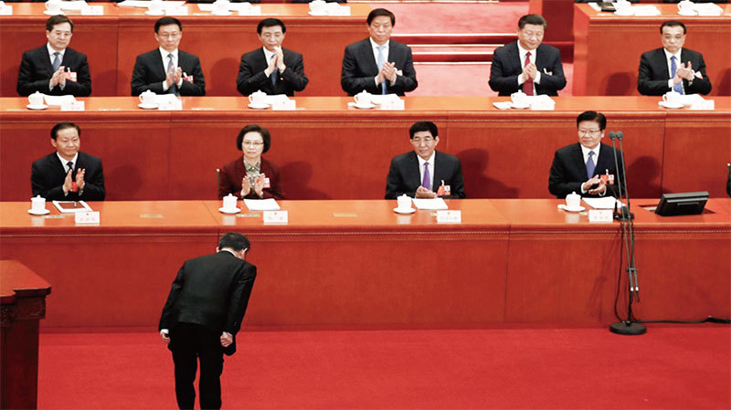 3月12日的中共人大會議上,最高法院院長周強宣讀工作報告時,王岐山中途離場,習近平沒拿正眼看他。(AFP)