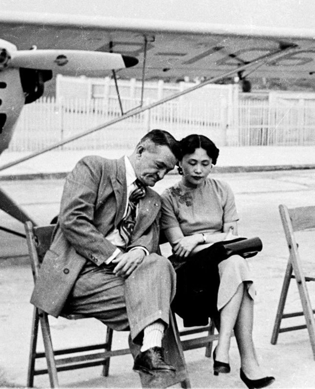 1951年美國飛虎將軍陳納德(Claire Chennault)(左)捐贈PIPER教練機給滑翔協會,妻子陳香梅(右)一同出席記者會。(中央社檔案照片)