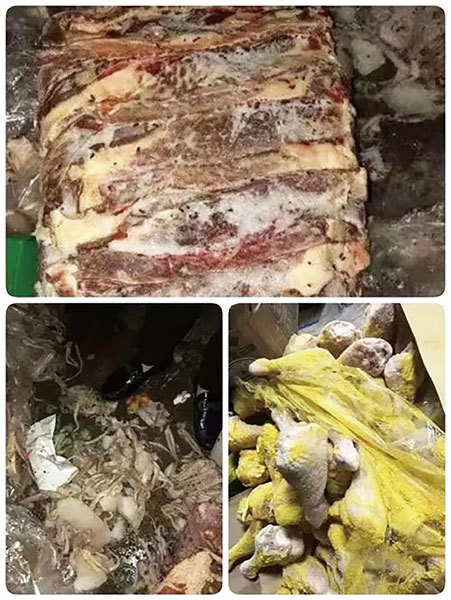 「成都七中(實驗學校)毒食堂事件」大逆轉,舉報此事的三名家長承認「造假」,並遭警方抓捕。圖為網傳的該學校食堂內的腐爛肉品照片。(網路圖片)