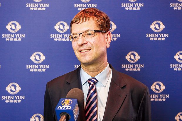 前德意志銀行首席運營官Dr. Thomas Bley,3月16日晚在柏林德意志歌劇院觀看了美國神韻國際藝術團的演出。Dr. Thomas Bley表示:「我非常喜歡這場演出,色彩、舞蹈和她的藝術表現力如此動人,這真是一個美妙的夜晚。」Dr. Thomas Bley去年看過神韻,深為陶醉,今年帶著太太和朋友一起來觀賞。