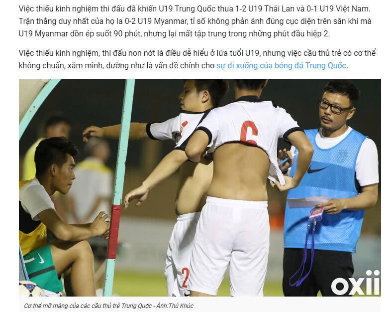 越南媒體曾嘲諷,中國球員空有身高,但面對技術出色的越南球員,在場上呆若木雞,毫無抵抗力。報導曬出了中國國青B隊球員的小肚腩照片,但沒有對照片進行太多的點評,只是表示,從中國球員紋身來看,已經說明他們缺乏職業精神。