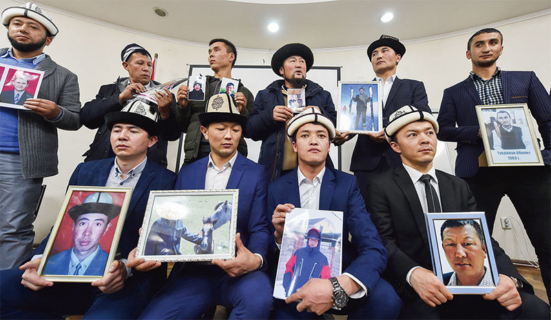 150萬維吾爾人和穆斯林被關進新疆集中營,幾千萬宗教少數民族、異議人士、人權律師等被不斷迫害。圖為2018年11月29日,吉爾吉斯人抗議親人被關押在新疆「再教育營」。(AFP)