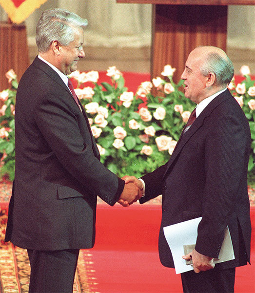1991年戈爾巴喬夫(右)和葉利欽(左)共同簽署的《解散蘇共聲明》寫道:「馬列主義這一套荒謬的邪說經過70多年的實驗,從理論到實踐上都是失敗的。歷史和事實都已證明這是徹頭徹尾的禍害人類的荒謬邪說。」(AFP)