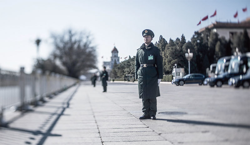 中共對美國和全世界構成了生死攸關的威脅,美國必須採取更強大的國防、經濟和政治措施加以抵制。圖為北京人民大會堂外的中共武警。(AFP)