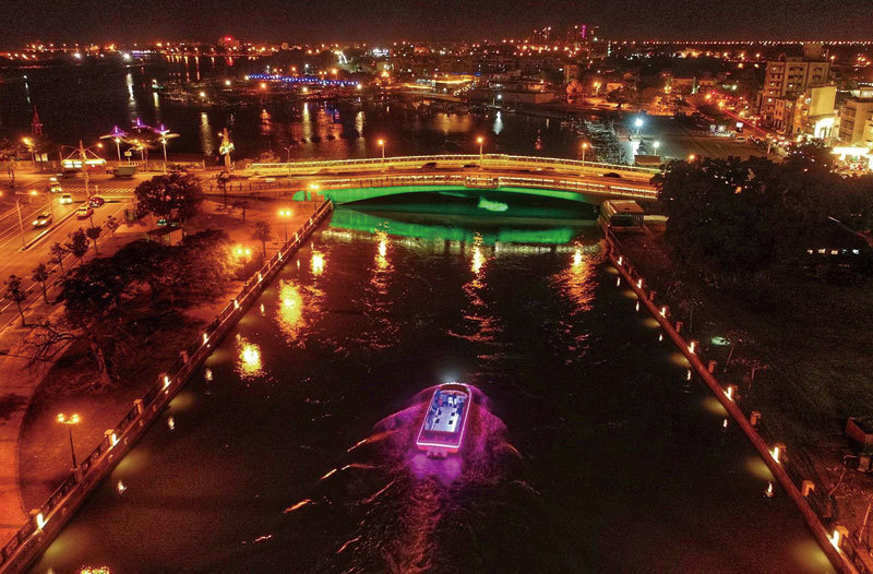 為營造夜間觀光亮點,推動臺南運河觀光遊船,南市府結合運河水影,在安億橋至新南橋之間的兩岸沿線,持續建置金色系燈光,打造三公里多「金色流域 」光環境。