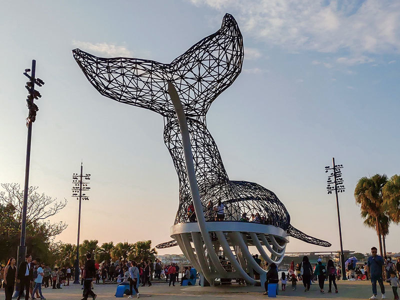 這件裝置藝術作品重達20幾噸,下半部巧妙以鯨魚腹部鋼管線條當作支撐,形成不落柱的結構,遊客可以進入「魚肚內」,拾級而上觀看港景及日落。