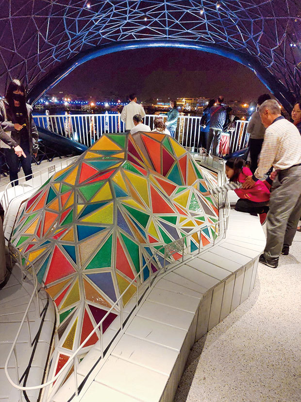 「大魚的祝福」,鯨魚造型體的上半部以不鏽鋼管焊接構成,整座量體完全不用螺絲,保有線條的純粹;鯨魚內部的臺灣意象也以不鏽鋼管焊接構成立體化,並鑲嵌彩色釉燒玻璃,形成一個象徵包容而豐富多彩的島嶼圖形。