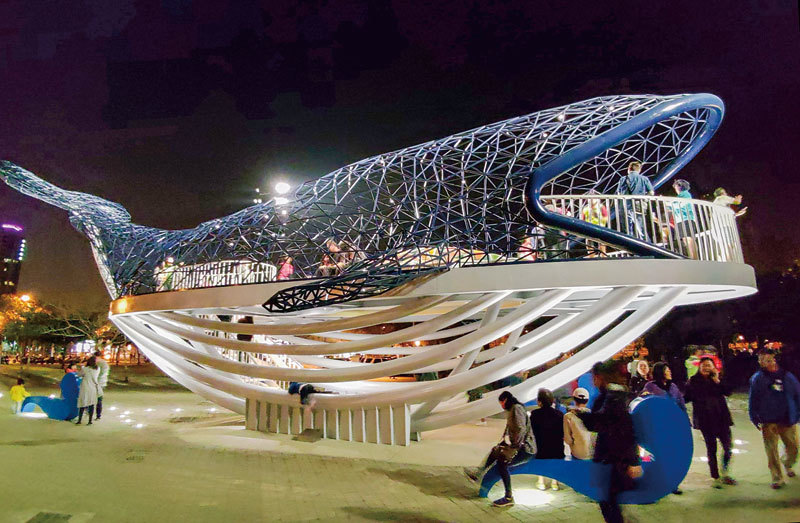 鯨魚的裡外裝設了燈光投射,夜幕來臨時呈現不同的景象。