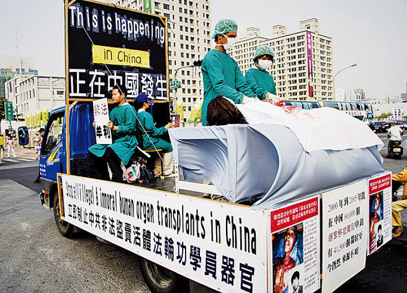 有網友說,張扣扣若被執行死刑,他被活摘器官的可能性非常大。圖為法輪功學員演示活摘器官之酷刑。(明慧網)