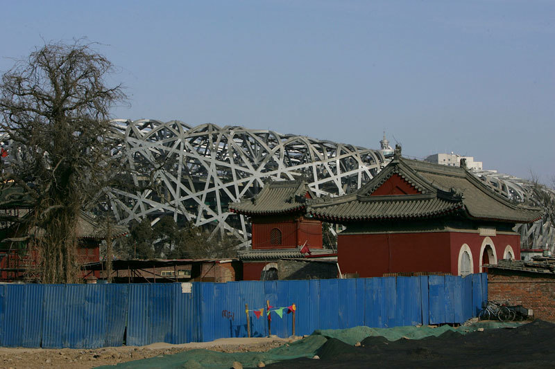 鳥巢和水立方在北京的中軸線附近,那裡是北京的老墳地,施工剛開始就挖出來許多棺材和屍骨,但施工仍然繼續。2004年8月27日下午3時,幾個工人剛剛拆掉娘娘廟兩扇廟門,一陣罕見大風平地而起。