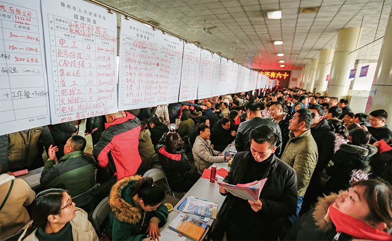 大陸就業市場出現六年來最差狀況,令經濟反彈更像是一個假象。圖為2019年2月12日山東省滕州一招聘會擠滿求職人潮。(AFP)