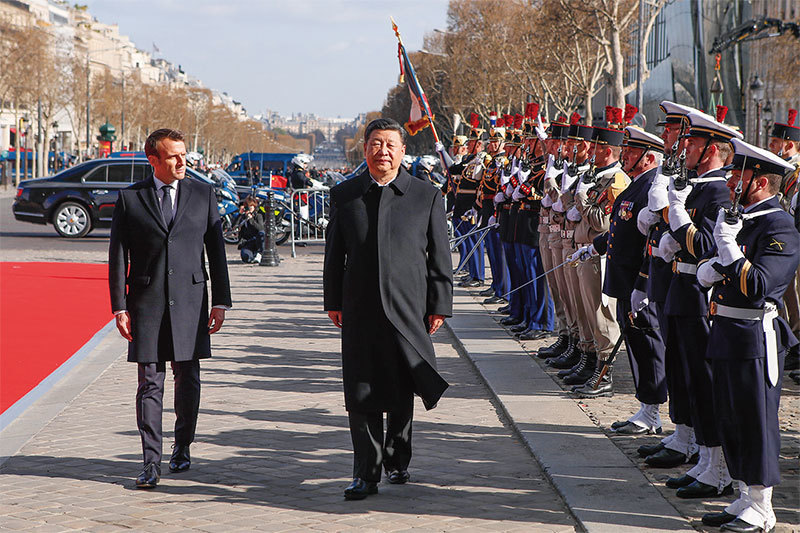 4月24日,《華爾街日報》突然翻炒一個月習近平腳傷的舊聞來隱射習。圖為3月25日檢閱儀仗隊時,法國總統馬克龍跟隨習近平慢慢前行。(AFP)