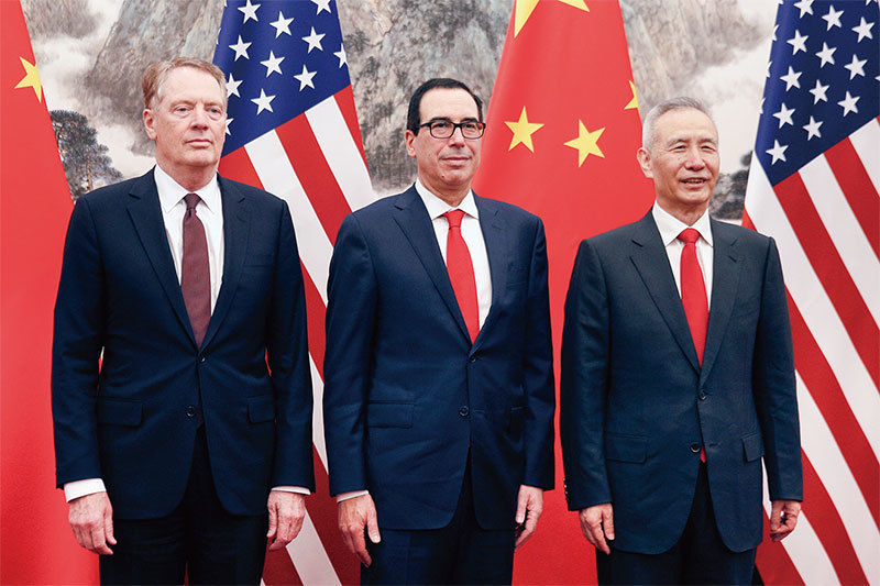 5月1日,美中在北京的貿易談判結束,美國財政部長姆欽(中)表示,雙方會談「非常有成效」。雙方5月8日將移師華盛頓,進行第11輪磋商。(AFP)