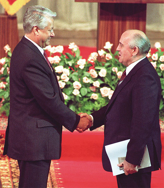 1991年戈爾巴喬夫(右)和葉利欽(左)共同簽署的《解散蘇共聲明》中寫道:「馬列主義這一套荒謬的邪說經過70多年的實驗,從理論到實踐上都是失敗的。歷史和事實都已證明這是徹頭徹尾的禍害人類的荒謬邪說。」(AFP)