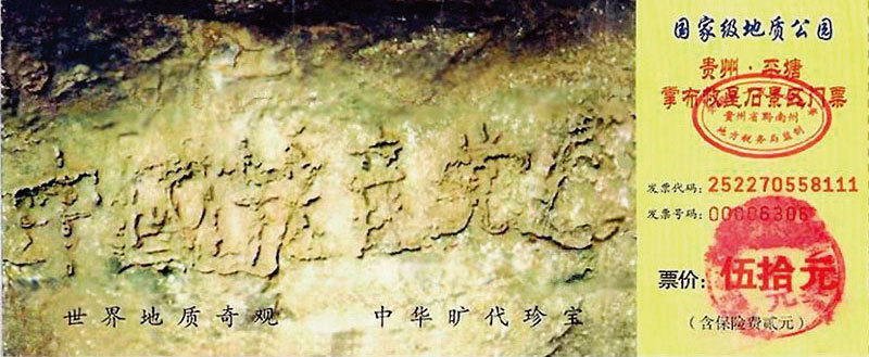 貴州省平塘縣掌布河谷風景區藏字石門票,「中國共產黨亡」六字清晰可辨。(新紀元資料室)
