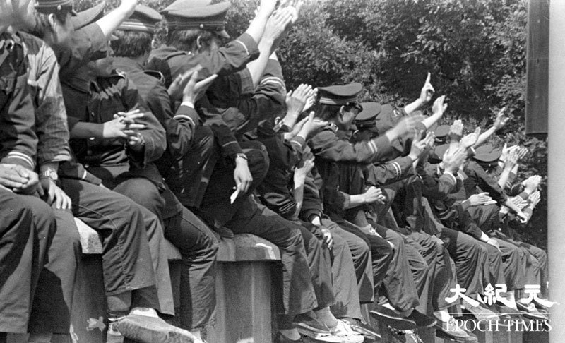 「六四」期間的北京街頭,坐在街邊的武警向遊行的學生和市民揮手。
