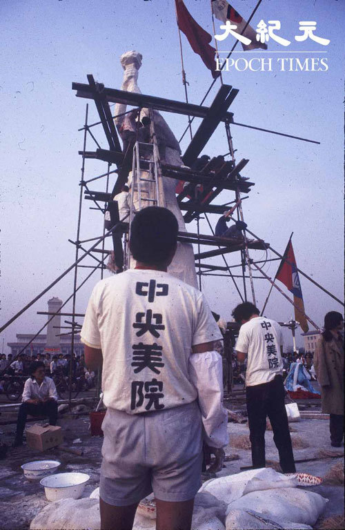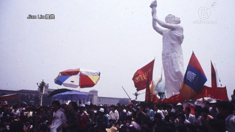 1989年5月底,中央美院學生在天安門廣場建造了一座自由女神像。19歲的劉建爬上腳手架,拍攝民眾和平抗議的場景。「當時我們搭腳手架就搭了三四天,能上去的 就兩個人,只有我和我的朋友。在腳手架上拍的照片。」「記得當時有個法國人說了半天,拍了一些照片還有視頻,就再也沒人能從腳手架那個角度拍了。」
