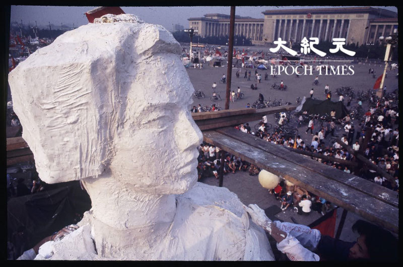 1989年5月底,和平抗議的民眾聚集在自由女神像旁,秩序良好。